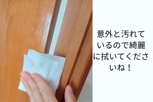 ①扉についた手垢などを取るために、洗剤をしみこませた布で接着面を拭く。