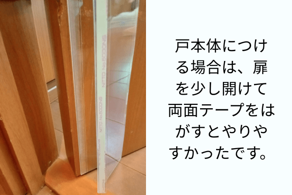 ①ドア本体→45度ほど少しあけて、両面テープをはがし貼る。